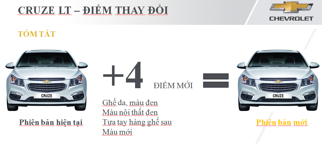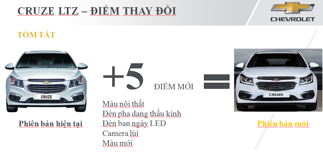 Chevrolet Cruze 2016 được GM Việt Nam nâng cấp thêm các tính năng và tiện nghi mới giúp xe tăng sức cạnh tranh với các đối thủ trong phân khúc xe sedan hạng C như Toyota Altis, Mazda 3, Ford Focus, Kia Cerato, Hyundai Elantra...